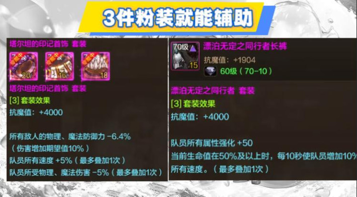 比如3件塔尔坦的印记首饰,可增加主C10%伤害和5%三速,以及减少5%伤害,还有3件防具套装也能加50点全属强。