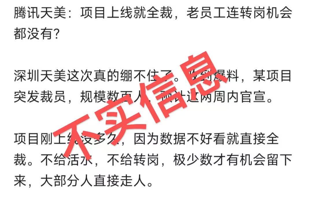 对于上述消息,接近天美人士向《21辟谣》表示,该消息并不属实。原天美J6团队负责的某个项目确有调整,但涉及的人数并非数百人,而是100余人。另外,被波及的员工拥有2个月的缓冲期,且内部正在积极推动活水转岗。如果员工在2个月后选择离开,也可以获得N+1的补偿。