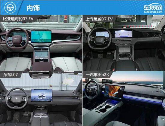 内饰布局与智能化配置成为区分车型档次的关键。深蓝L07搭载15.6英寸2.5K超高清向日葵屏,支持左右15°偏转,配合AR-HUD与零重力座椅,科技体验领先。丰田bZ3通过方向盘加热与空气质量监测系统,强化舒适性表现。荣威D7 EV采用内嵌式中控屏,换挡机构为电子式怀挡,整体配置水平中规中矩。比亚迪海豹07 EV则凭借悬浮式中控屏与电子挡把的组合,平衡了实用性与设计感。
