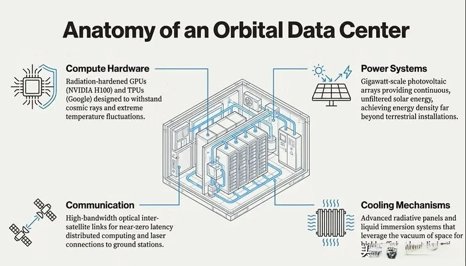 图2:轨道数据中心结构示意图 图中清晰标注了计算硬件、太阳能供电系统、光学通信链路和辐射冷却机制,展示了太空设施与地面数据中心的差异。