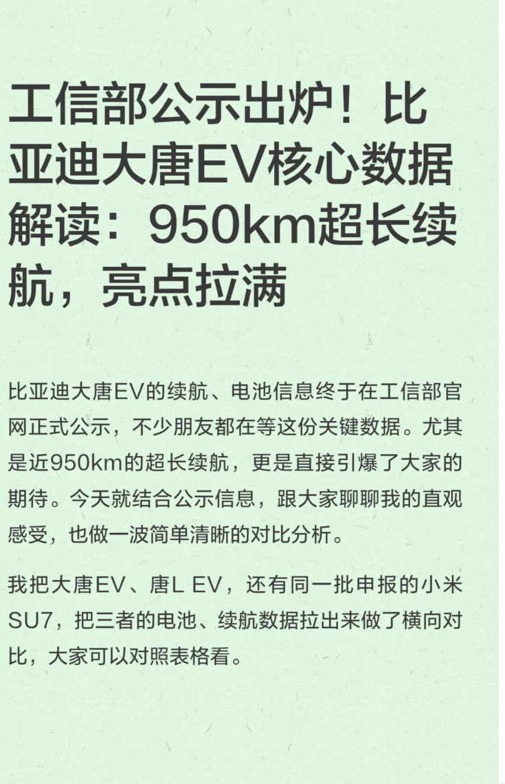 综合来看,比亚迪大唐 EV 核心数据全面领先,续航、动力、补能三大核心指标均无短板,再加上比亚迪成熟的三电技术与品控体系,量产上市后势必成为爆款车型。随着申报信息落地,新车上市节奏加快,中大型纯电 SUV 市场即将迎来新的王者,也将为消费者带来更优质的出行选择。